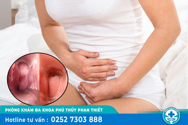 Triệu chứng: Cảm giác nặng vùng chậu, thấy cục thịt lồi ở cửa mình, kèm đau lưng, đau bụng dưới, huyết trắng bất thường.