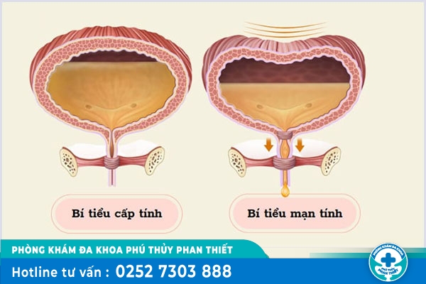 ++ Bí tiểu mãn tính: Bí tiểu diễn ra trong một thời gian dài. Người bệnh đi tiểu được nhưng bàng quang không hết nước tiểu. Ở giai đoạn mãn tính không có biểu hiện rõ ràng trong thời kỳ ban đầu, khiến nhiều người bệnh không để ý sẽ không phát hiện tình trạng bất thường. Bí tiểu mãn tính dễ dẫn đến nhiều biến chứng đến sức khỏe, cuộc sống người bệnh.