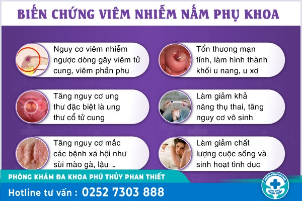 ++ Ảnh hưởng phụ nữ mang thai: Nhiễm nấm phụ khoa sẽ khiến cơ thể của mẹ sẽ gầy yếu, thường xuyên mệt mỏi, dễ nhiễm trùng ối, sinh non, sảy thai, khó chuyển dạ. Em bé dễ mắc các dị tật về mắt, về da, về đường hô hấp ngay từ khi sinh ra.