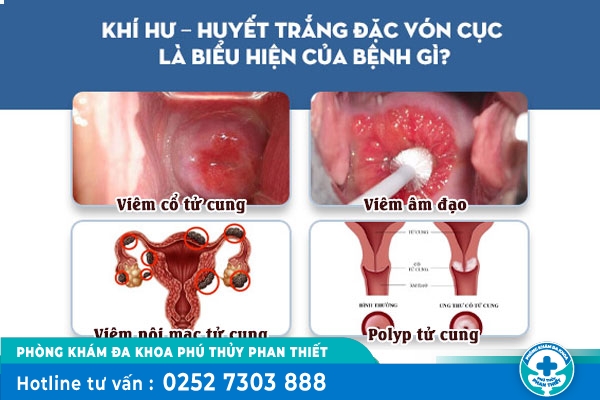 ++ Viêm cổ tử cung: Dịch tiết âm đạo màu trắng đục, có khí lẫn máu, dạng đặc quánh, để một lúc thì bị vón cục như cục thạch, ngứa ngáy âm đạo, tiểu buốt,...