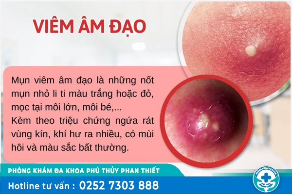 Do do nấm candida, trùng ro,... gây ra.  Dấu hiệu cơ bản để nhận biết viêm âm đạo có là hình ảnh nổi mụn li ti màu đỏ hoặc màu trắng như bóng nước tại vùng kín của nữ giới kèm theo khí hư bất thường (có màu lạ, mùi hôi, tiết ra nhiều).